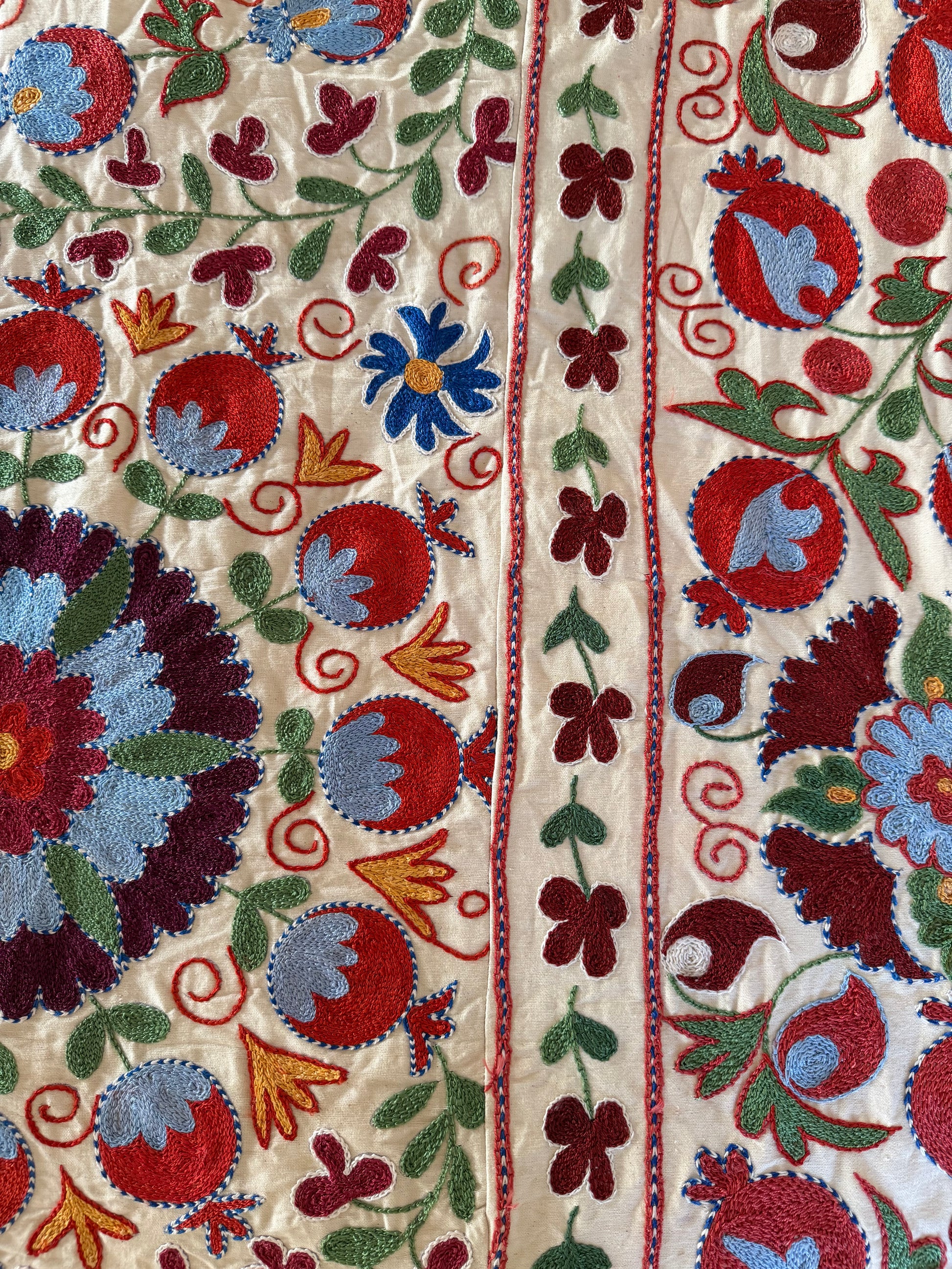 Experience the allure of this incredible Suzani fabric, elegantly adorned with exquisite colours and intricate decorations.