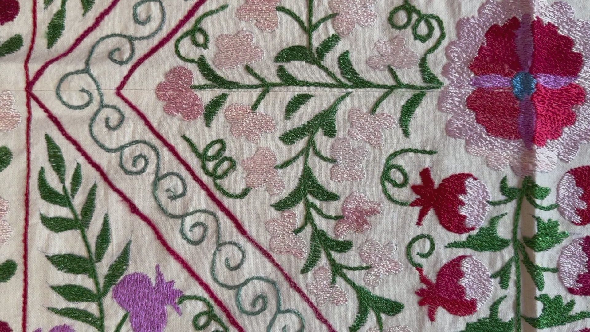 This authentic Uzbek Suzani fabric brings a piece of history and culture into your home, allowing you to indulge in its captivating beauty and exceptional artistry.