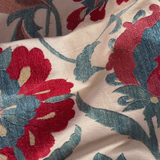 Whether you're seeking a bold statement piece or a delicate accent, this Suzani fabric delivers both in spades. Its ability to blend seamlessly into any decor style, be it contemporary, bohemian, or eclectic, is truly remarkable.